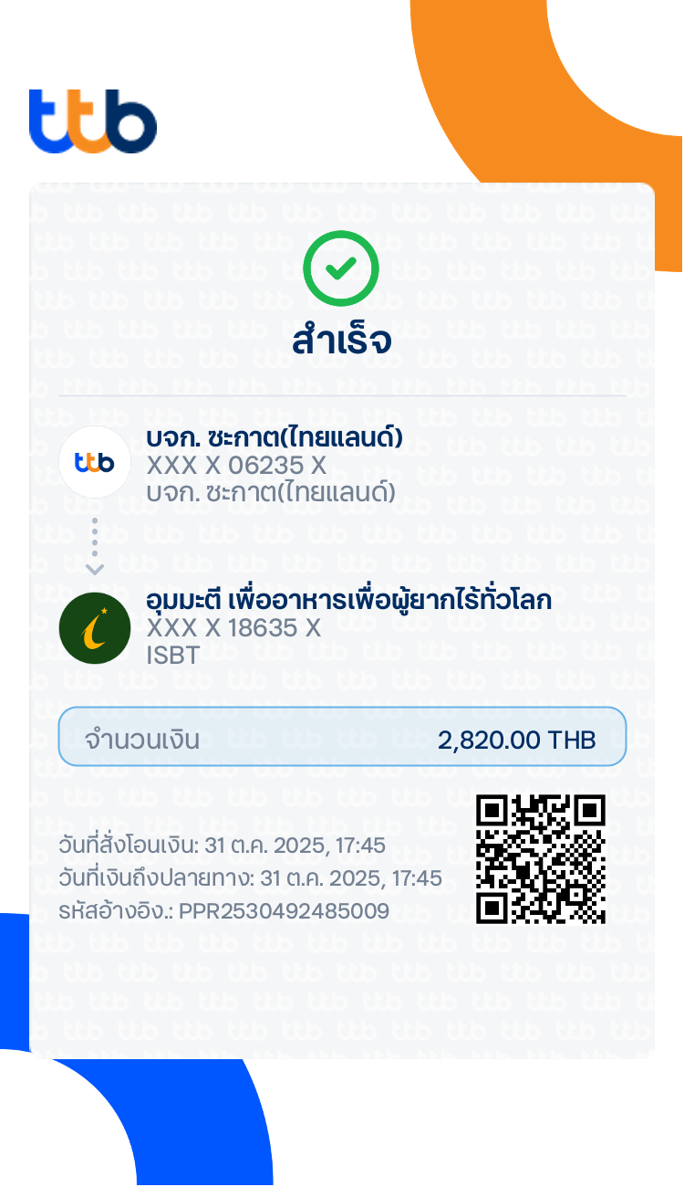 ทาง Zakat Thailand ส่งต่อเงินบริจาค "มนุษยธรรม" ที่พี่น้องบริจาคผ่านแพลตฟอร์ม Zakat Thailand แก่ "มูลนิธิอุมมะตี" เพื่อ "ช่วยฉุกเฉินวิกฤตมนุษยธรรมซูดาน" จำนวน 2,820 บาท