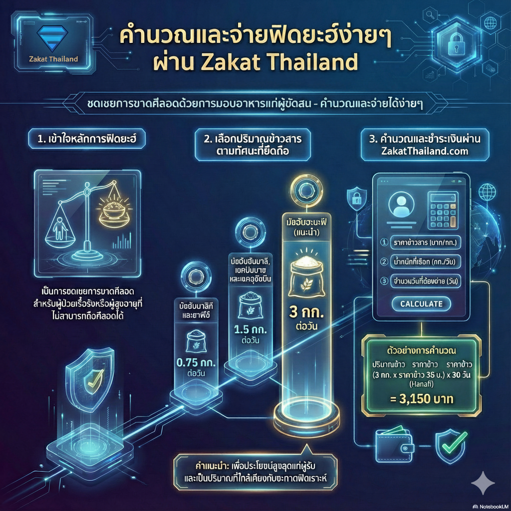 การคำนวณและชำระฟิดยะห์ ผ่าน Zakat Thailand ได้ที่https://www.zakatthailand.com/th/calculate/fidyahs